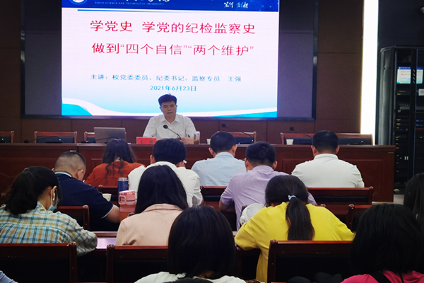 6月23日上午,校党委委员、纪委书记、监察专员王强在龙湖校区西辅楼111会议室为纪检监察党支部党员和财经学院师生以“学党史、学党的纪检监察史,坚定‘四个自信’做到‘两个维护’”为题讲授了一堂生动的党史学习教育专题党课。