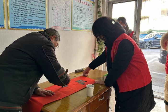 活动中,书画协会精心策划了书画作品展,汇聚了来自老年学生们的艺术作品,展示了他们的艺术风采和创作风格。同时,汪琪作为志愿者在现场加入“写春联”活动,精心为老年学生准备必需物品,布置场地,完成后进行晾晒等,让参与者亲身体验到书画艺术的魅力,感受艺术带来的愉悦和心灵的进化。一幅幅精美的对联就此诞生,作品也被送到了各家各户,彰显着欢乐热闹的气氛。