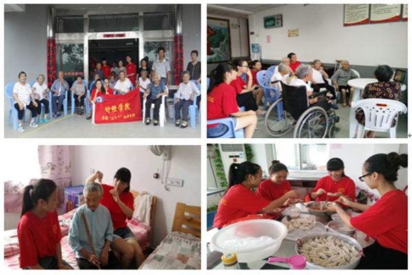 到了老年公寓,团队成员们主动帮老人们梳头、整理床铺、打扫卫生,询问老人的饮食起居情况和身体健康状况。听到老人们聊天时说起饺子的美味,同学们第二天早早地起了床,买菜的买菜、剁馅的剁馅,为老人们准备了一顿丰盛的饺子宴。虽然饺子模样一般,但是看着老人们吃饺子时开心的样子,同学们也都很高兴。饭后同学们陪着老人们散步,老人们情不自禁地诉说起他们年轻时候的故事,一张张慈祥的面容上映着夕阳的余晖,温暖而美好。