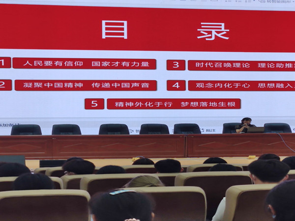 薛枫以建党100周年为契机,对中国共产党的发展历史做了简要的讲解,阐述了学党史的重要意义在于学史明理、学史增信、学史崇德、学史力行,并分析了其精神内涵和内在逻辑。随后,她从“人民要有信仰,国家才有力量”、“时代召唤理论,理论助推实践”、 “凝聚中国精神,传递中国声音”、“观念内化于心,思想融入灵魂”、“精神外化于行,梦想落地生根”五个方面论述践行社会主义核心价值观的基本规则、主要路径和机制建构。最后,她结合革命先辈的事例,勉励全体学员树立崇高的理想信念,志存高远,脚踏实地,认真学习、思考和实践,切实提高自身素质及服务广大同学的能力与水平。