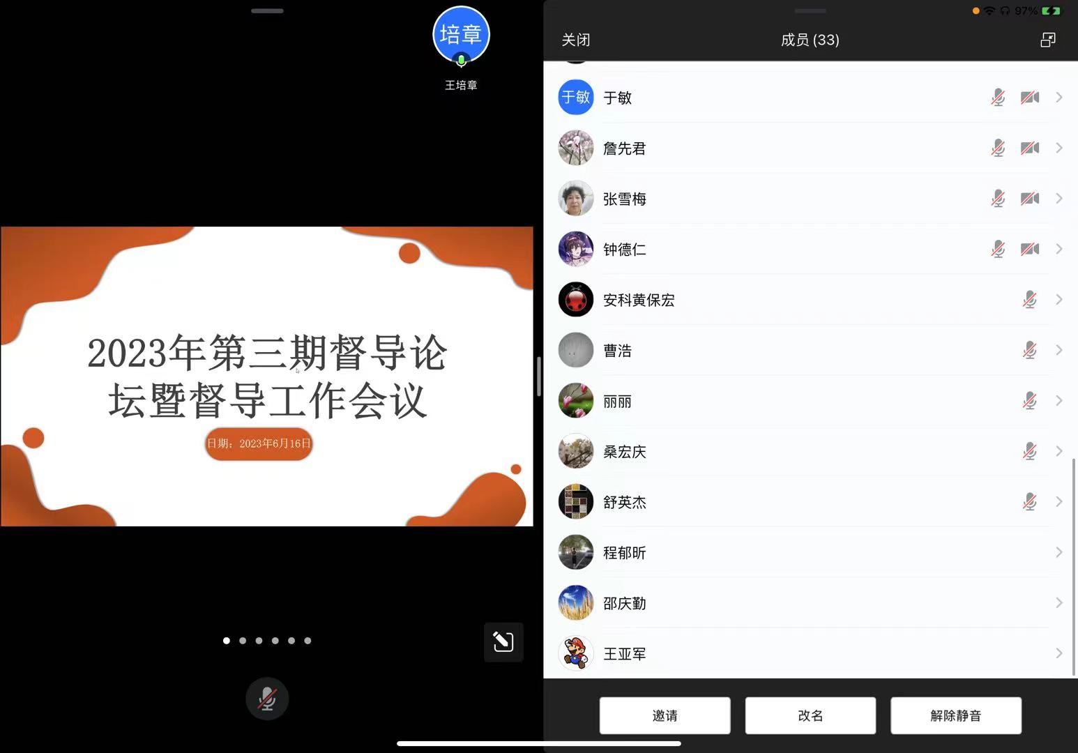 为加强教学督导与教学质量监控工作、保障学校教学工作顺利进行,促进教育教学质量提升,6月16日下午,督导考核办公室利用腾讯会议平台,举行第三期督导论坛暨六月份教学督导线上工作会议,全体校督导员、院督导组组长及督导考核办公室工作人员参加了会议,会议由督导考核办公室徐梦雨老师主持。