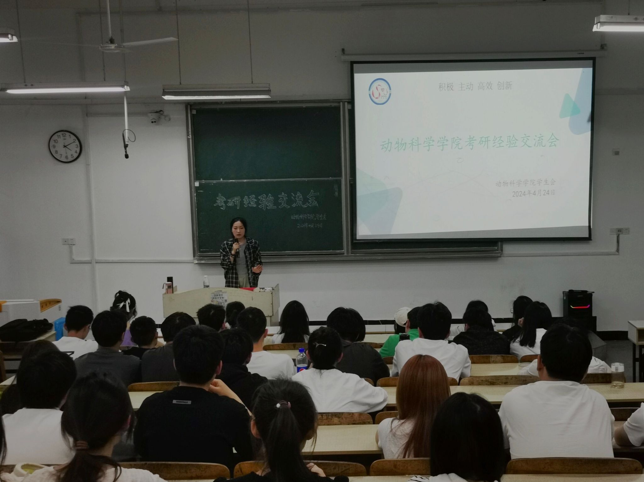 为帮助同学们明确考研方向、熟悉备考流程、提升上岸信心,充分发挥朋辈互助和示范引领的作用。4月24日下午,动物科学学院于求知楼A103举行考研经验交流会。此次交流会邀请动物医学204班马婷来为大家传授学习经验,由徐莹莹主持。