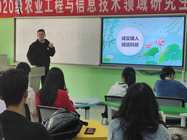 为教育和引导学生弘扬诚信美德,践行诚信, 10月24日,21级全体畜牧研究生在求B310教室开展“诚实做人,诚信科研”主题班会。