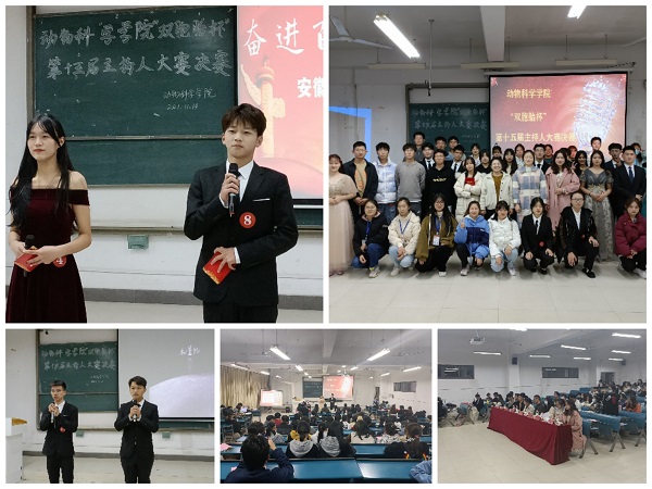 为进一步丰富校园文化生活,提高学生艺术修养,11月14日晚,动物科学学院在新B103教室举办“双胞胎杯”第十五届主持人大赛决赛。学院党委副书记、纪委书记汤帅,院学生会指导老师胡文丽,辅导员范雨梦出席本次活动。本次比赛的评委由校广播台台长齐长慧、校菁英主持社会长尹云庆、农学院学生会执行主席胡易立、资源与环境学院学生会执行主席刘彪、院学生会执行主席杨林组成。邵艳和吴天君担任主持人。