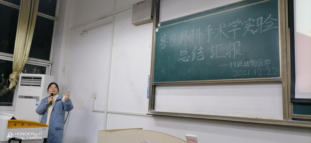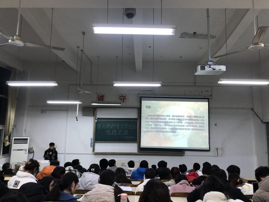 为提高2019级动物医学专业学生的外科手术能力和专业素养,12月22日,动物科学学院在求知楼A105开展了兽医外科手术学实验总结汇报活动。本次活动由动物医学192班学生刁节龙主持,李静老师和阮崇美老师出席,班级助理动物医学18级孙朝阳、王旭、杨静及动物医学19级全体学生参与会议。