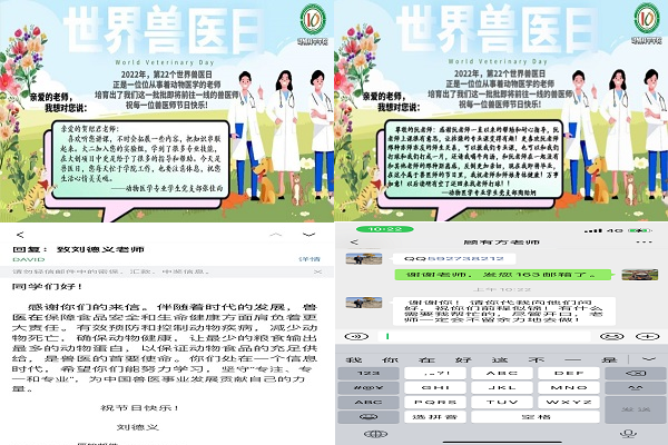 动医专业学生党支部党员立足“世界兽医日”、“毕业”“感恩”、“祝福”等关键词,在4月30日当天,以电子贺卡的形式向他们心中最崇敬的老师送上节日的祝福,对老师们渊博的学识、严谨的教学、高尚的品行和正直的为人表达敬意,对老师们悉心的教导、学业的指点、耐心的答疑、温暖的鼓励表示感谢。