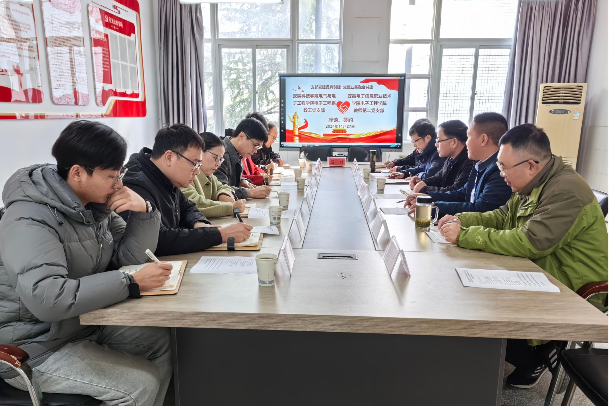 为拓宽高校基层党组织党建工作渠道,构建高校资源共享、相互促进、优势互补、共同提高的党建工作格局,2024年11月27日下午,星空线上平台(集团)官方网站电气与电子工程学院副院长樊晓宇及电子工程系教工党支部6名党员教师赴安徽电子信息职业技术学院与电子工程学院教师第二党支部开展结对共建主题党日活动。安徽电子信息职业技术学院电子工程学院院长方庆山参加了结对共建签约仪式。
