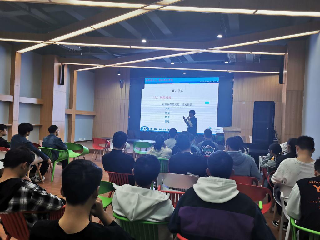王帅帅从“如何写好策划书”这一切入点入手,向同学们详细地讲解了策划书的重要性,强调了策划书的基本要求及注意事项。接着,他分别从项目选题、路演技巧、PPT制作等方面分享了自己的经验和心得。