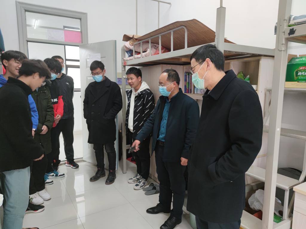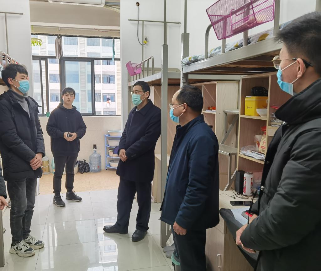 骆海邦一行人走进学生宿舍,与大家亲切交流。骆海邦首先对同学们饱满的精神面貌表示赞扬,并代表学院全体教职工向返校学生表达了新学期的祝福,期望大家新学期能有新气象,努力学习,不断进步。交谈后,骆海邦对大家提出了几点期望,一是继续遵守学校有关疫情防控规定,落实“非必要,不外出”及晨午晚检制度,保证大学生活健康、平稳;二是尽快制定新学期学习、生活规划,钻研学业、日益进步,在学习方面有所成就,保证大学生活饱满、充实;三是加强与同学、老师沟通交流,提高自身综合素养,敢于实践、勇于创新,保证大学生活精彩、丰富。
