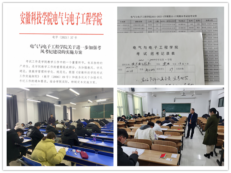 制定工作方案,加强考场巡查巡视。考试工作是学院日常工作中的重要环节,根据学校要求,结合学院实际,学院出台了《电气与电子工程学院关于进一步加强考风考纪建设的实施方案》,成立以学院党政领导为组长的考风考纪建设领导组,开展考试相关工作。 学院及时做好监考教师培训管理工作,落实责任制,强化监考老师责任意识,维护考试的公平公正。考试期间,学院党政领导、教学督导员、辅导员巡视值班,深入考场一线,及时了解考场情况。