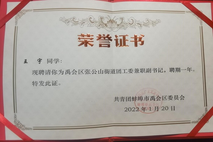 信中指出,王宇同学作为蚌埠籍大学生,能够主动请缨,积极响应号召,在家乡街道任职,在实践中锻炼自我,荣膺担当;思想开路,实干架桥,践行新时代大学生的理想与担当,能够在平日工作里以谦逊平和、踏实肯干的态度去了解群众,运用所学所思去帮助解决居民群众的实际问题,充分展现了星空线上平台(集团)官方网站学子的奕奕风采。