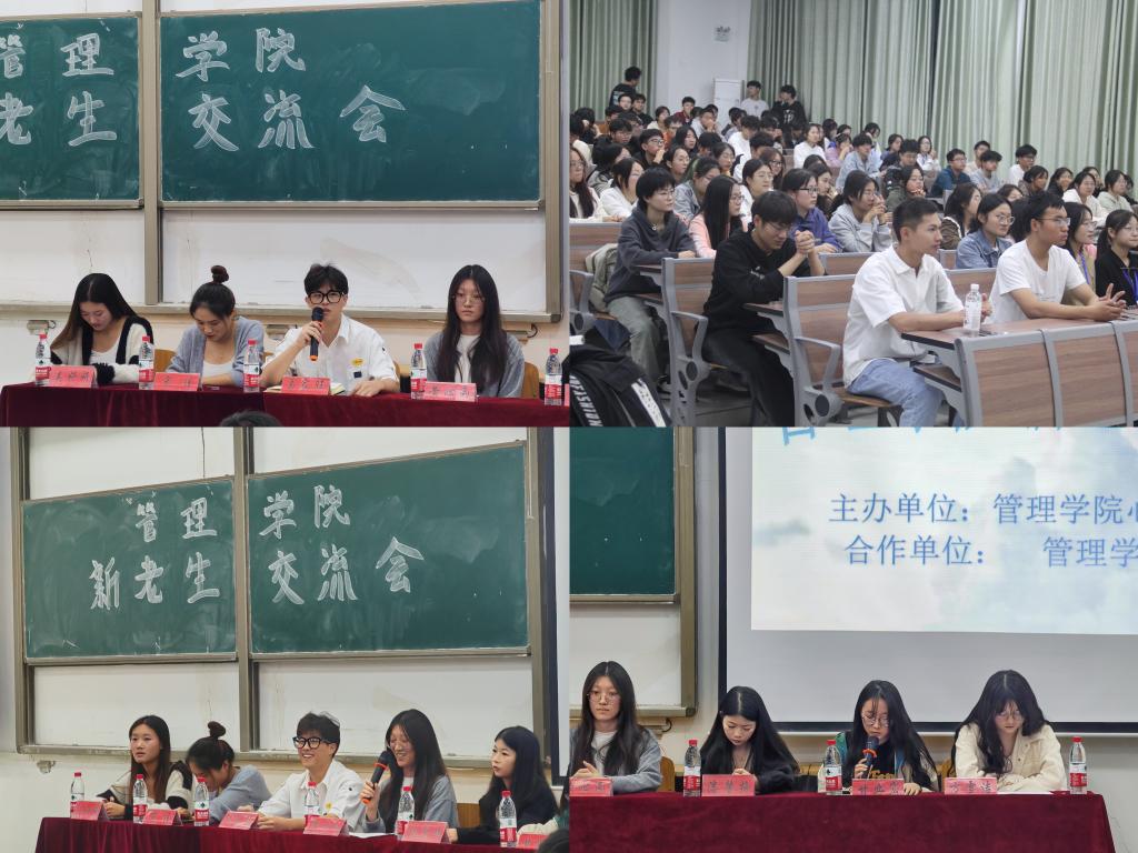 10月29日晚,管理学院举办了2023年新老生交流会,由学院心理委员联合会和学生会共同承办。新老生交流会邀请了21、22优秀老生代表及退伍学生代表,为新生答疑解惑,分享了自己的学习经验,鼓励新生积极参加学科竞赛,勇于尝试,不畏难,敢尝试。老生代表们积极、充分的准备及新生同学们的热情、踊跃的参与提问,使得这场新老生交流会圆满结束。此次活动有助于新生尽快适应新环境、可以发掘自身能力,并且创造一个传承和交流经验的平台,以帮助学生更好地适应大学生活。
