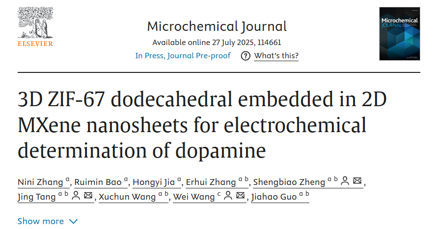 7月27日,化学与材料工程学院唐婧教授课题组2021级本科生张妮妮以第一作者身份在《Microchemical Journal》(SCI二区期刊,影响因子:5.1)上发表了题为《3D ZIF-67 dodecahedral embedded in 2D MXene nanosheets for electrochemical determination of dopamine》的学术论文。