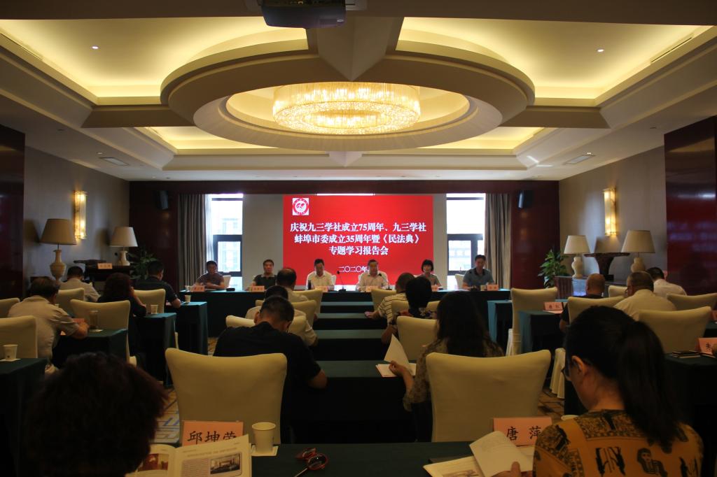 8月28日下午,九三学社蚌埠市委召开了庆祝九三学社成立75周年、九三学社蚌埠市委成立35周年暨《中华人民共和国民法典》专题学习报告会。蚌埠市副市长、社蚌埠市委主委陈忠卫,中共蚌埠市委统战部常务副部长华如军,原市政协副主席、原社蚌埠市委主委张秉臣以及我社社员等50余人参加了报告会。市委统战部常务副部长华如军应邀出席并讲话。会议分两个阶段进行,社蚌埠市委主委陈忠卫,社蚌埠市委副主委李小军分别主持了会议。我校九三学社小组组长程郁昕、社员华金玲参会会议。
