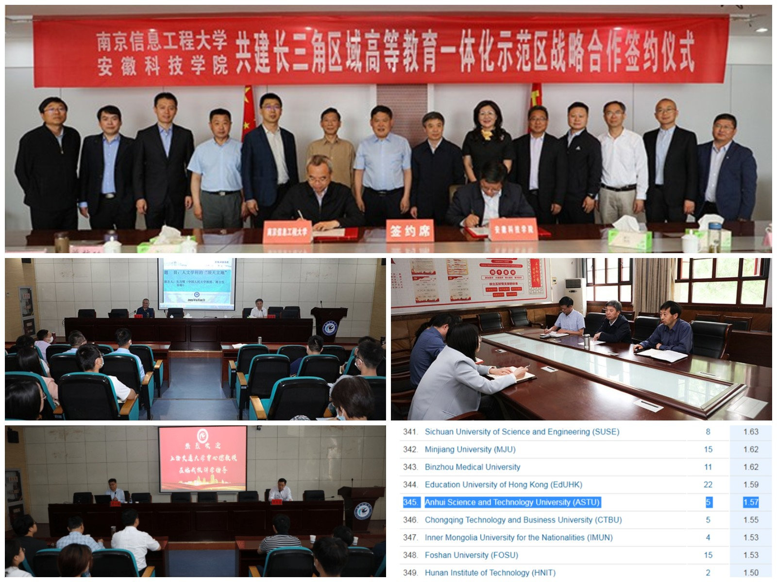 【综述】2020年1月至2021年5月期间,我校教师分别在The European Physical Journal C、European Physical Journal C、Analytical Chemistry及Chemical Communications等自然指数(Nature Index)收录期刊发表6篇高水平研究论文。在自然指数发布的全国853所研究单位年度排行榜中,我校位列345位;5月17日,我校与南京信息工程大学共建长三角区域高等教育一体化示范区战略合作协议签约仪式在凤阳校区图书馆十楼会议室隆重举行,南京信息工程大学党委副书记、校长李北群,党委常委、总会计师胡明保,我校党委书记蒋德勤,党委副书记、校长李震,党委委员、副校长李升和出席会议。李震主持签约仪式;5月18日,《淮河流域农耕文明史》编著工作推进会在中办公楼大会议室举行,校党委书记蒋德勤出席,校服务地方发展研究院院长詹秋文主持会议。蒋德勤强调,历史是最好的教科书,组织编著《淮河流域农耕文明史》等系列课程教材,通过高质量出版、走进学生选修课堂等举措,确保广大学生知史爱党、知史爱国和知史爱农;5月28日,上海交通大学特聘教授、博士生导师曹心德教授应邀来我校作题为《污染场地土壤地下水系统中重金属迁移扩散与预测》的学术报告,校党委委员、副校长黄远友主持报告会。5月31日,中国人民大学文学院博士生导师朱万曙教授应邀来我校作题为《人文学科的“顶天立地”》的学术报告,校党委书记蒋德勤主持报告会。