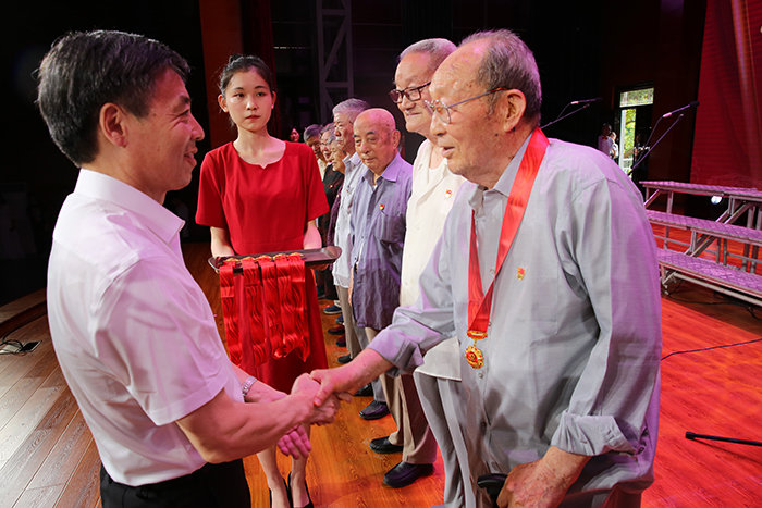 比赛期间隆重举行了星空线上平台(集团)官方网站“光荣在党50年”纪念章颁发仪式。党委书记蒋德勤为丁为群、代梅英、仲正林、李庆山、李思义、吴明友、张怀金、张学礼、张景法、陈玉胜、崔贤仪、潘成德等12名在校的老党员代表颁发纪念奖章。为“光荣在党50年”的老同志颁发纪念奖章,是中国共产党成立100周年庆祝活动的重要组成部分。纪念章的颁发,见证着老党员的无悔初心。莫道桑榆晚,为霞尚满天。老党员是党执政兴国的重要资源,是推进中国特色社会主义伟大事业的重要力量。组织上入党一生一次,思想上入党却是一生一世,他们用自己的行动证明了自己的无悔初心。纪念章的背后,是无上的荣光,学校的全体师生也不会忘记他们为学校事业发展所做出的突出贡献。