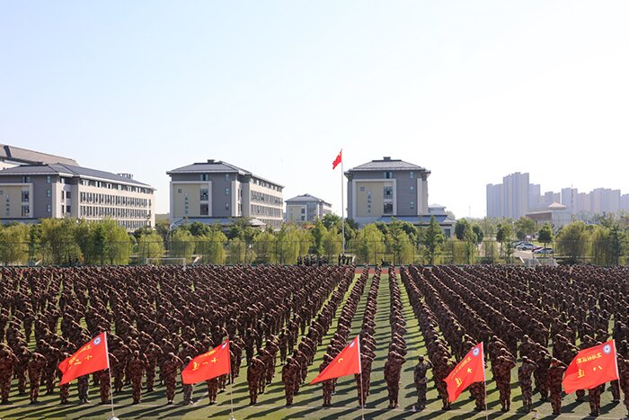 9月22日上午,我校龙湖校区2021级新生开学典礼暨军训动员大会在南田径场隆重举行。校党委副书记、校长李震,陆军装甲兵学院蚌埠校区学员九大队副大队长、龙湖校区军训团团长王博杨,党委委员、副校长黄远友,党委委员、纪委书记、监察专员王强,党委委员、副校长黄友锐,党委委员、副校长李升和出席大会并在主席台就座。校党委书记蒋德勤因公出差在外地,不能参加开学典礼,特致电向全体新同学表达诚挚问候和美好祝愿,祝同学们学业有成,健康快乐。学校各学院党政主要负责人、军训领导组成员、有关部门负责同志等参加大会。大会由黄友锐主持。