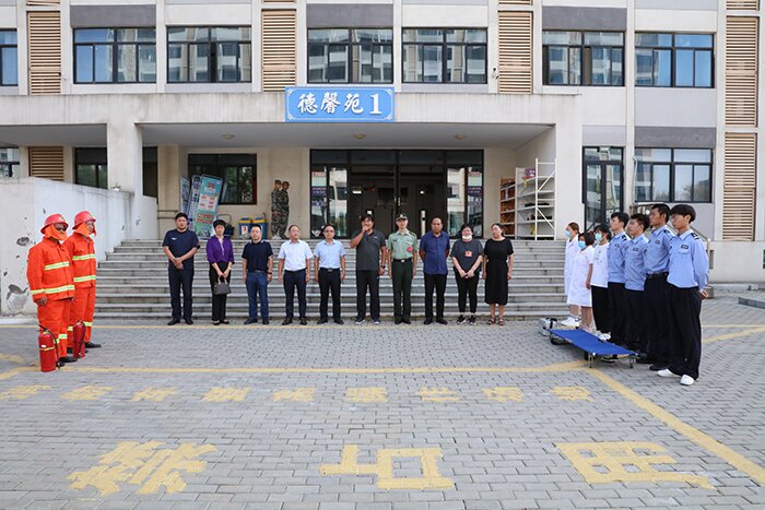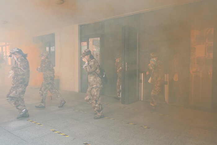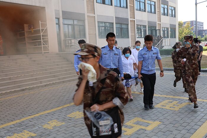 在消防疏散演练中,各学院按照消防应急疏散演练预案将学生有序组织到指定地点,各连军训教官为学生讲解消防应急疏散知识及注意事项,各学院辅导员到各楼层进行疏散路线引导,医护人员进行现场保障,消防维保人员营造演练场景,各方紧密协作,全体新生积极配合,用事先准备好的湿毛巾等逃生用品,捂住口鼻,在急促的消防警报声中,俯身快速有序疏散到室外空旷地带。