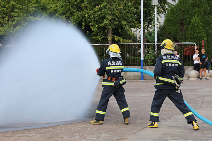 在灭火演练中,凤阳县消防救援大队琴音路站副站长徐鹏为师生宣讲了校园消防安全基本知识、干粉灭火器使用方法和大学生公寓等消防重点单位防火注意事项,以及初起火灾扑救与逃生方法。消防救援人员向全体参演人员展示了先进的消防救援装备,现场演示专业化火灾扑救技能,指导广大同学进行了灭火器使用与初起火灾的扑救演练。