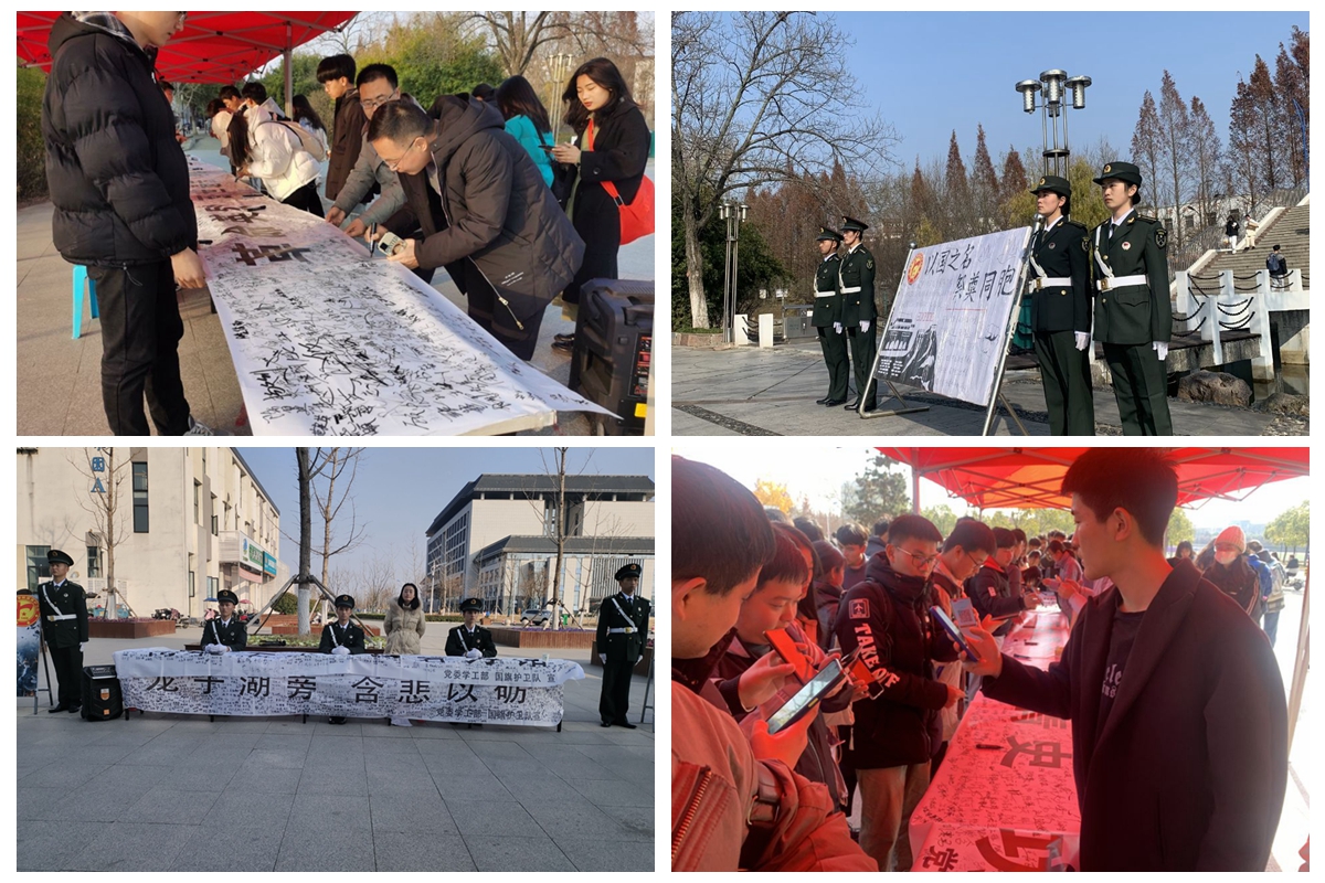 为纪念第八个国家公祭日,教育引导新时代大学生不忘国耻、铭记历史,12月13日,我校在凤阳校区和龙湖校区分别举行国家公祭日爱国主义主题教育活动——纪念南京大屠杀死难者国家公祭日签名活动。活动由党委学工部主办、校国旗护卫队承办,党委学工部副部长胡文靖,党委学工部秘书、国旗护卫队指导老师石志成,学生处王丽荣老师分别到活动现场指导并签名,依托PU口袋校园全校4340余名学生参加主题教育活动。