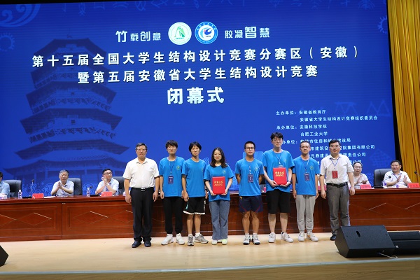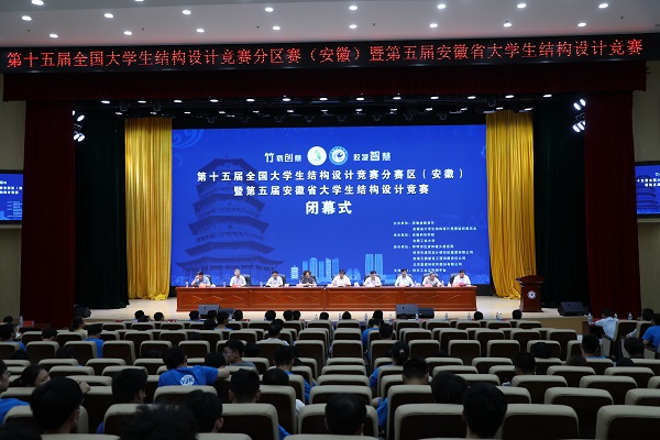 6月27日下午,由安徽省教育厅、安徽省大学生结构设计竞赛组织委员会主办,星空线上平台(集团)官方网站、合肥工业大学承办的第十五届全国大学生结构设计竞赛分区赛(安徽)暨安徽省第五届大学生结构设计竞赛在我校龙湖校区图书馆东辅楼报告厅圆满闭幕。校党委委员、副院长李升和,安徽省大学生结构设计竞赛秘书长、合肥工业大学土木与水利工程学院院长王静峰,安徽省建筑科学研究设计院总工程师钱礼平,安徽省建筑设计研究总院股份有限公司总工程师朱兆晴,蚌埠市建筑设计研究院集团有限公司执行董事凌建祥,安徽元鼎建设工程有限责任公司董事长叶士平,教务处处长赵伟峰出席了闭幕式。仪式由建筑学院院长张远兵主持。