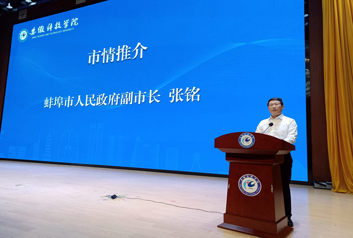 张铭首先代表蚌埠市委市政府对学校长期以来为蚌埠经济社会发展做出的贡献表示衷心感谢。他表示,蚌埠市委市政府高度重视学校在蚌埠市的发展和建设,用万分诚意支持学校跨越式发展。他向我校本硕毕业生发出留蚌就业创业的邀约。他强调,蚌埠有基础,留在蚌埠创业空间大;蚌埠有力度,留在蚌埠创业条件优;蚌埠有温度,留在蚌埠创业保障全。