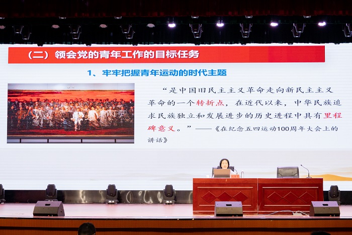 闪茜菁以“党的青年工作的两个问题”为导言,通过解读习近平总书记围绕党的青年工作发表的一系列重要论述,带领全体学员深刻地认识习近平总书记关于青年工作的重要思想的价值意蕴,领会习近平总书记关于青年工作的重要思想的核心要义,学懂弄通党的青年工作的相关要求。她表示,青年是祖国的未来、民族的希望,也是中国共产党的未来和希望。“青马”学员要牢记“七个明确”,清楚地认识党的青年工作的地位作用、目标任务、职责使命和实践要求,牢牢把握青年运动的时代主题,坚定理想信念,锤炼优良作风,努力成为一名堪当民族复兴大任的时代新人,勇作走在时代前列的奋进者、开拓者、奉献者。