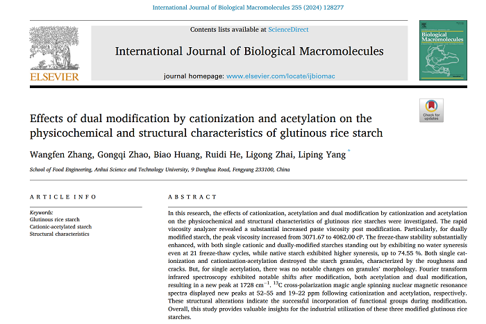 近日,我校2021级食品加工与安全领域研究生张王芬在生化与分子生物学领域Top一区期刊International Journal of Biological Macromolecules(IF=8.2)在线发表题为“Effects of Dual Modification by Cationization and Acetylation on the Physicochemical and Structural Characteristics of Glutinous Rice Starch”的研究论文。食品工程学院粮油及其副产物精深加工团队与营养科技创新团队负责人杨丽萍副教授为通讯作者,星空线上平台(集团)官方网站为唯一完成单位。