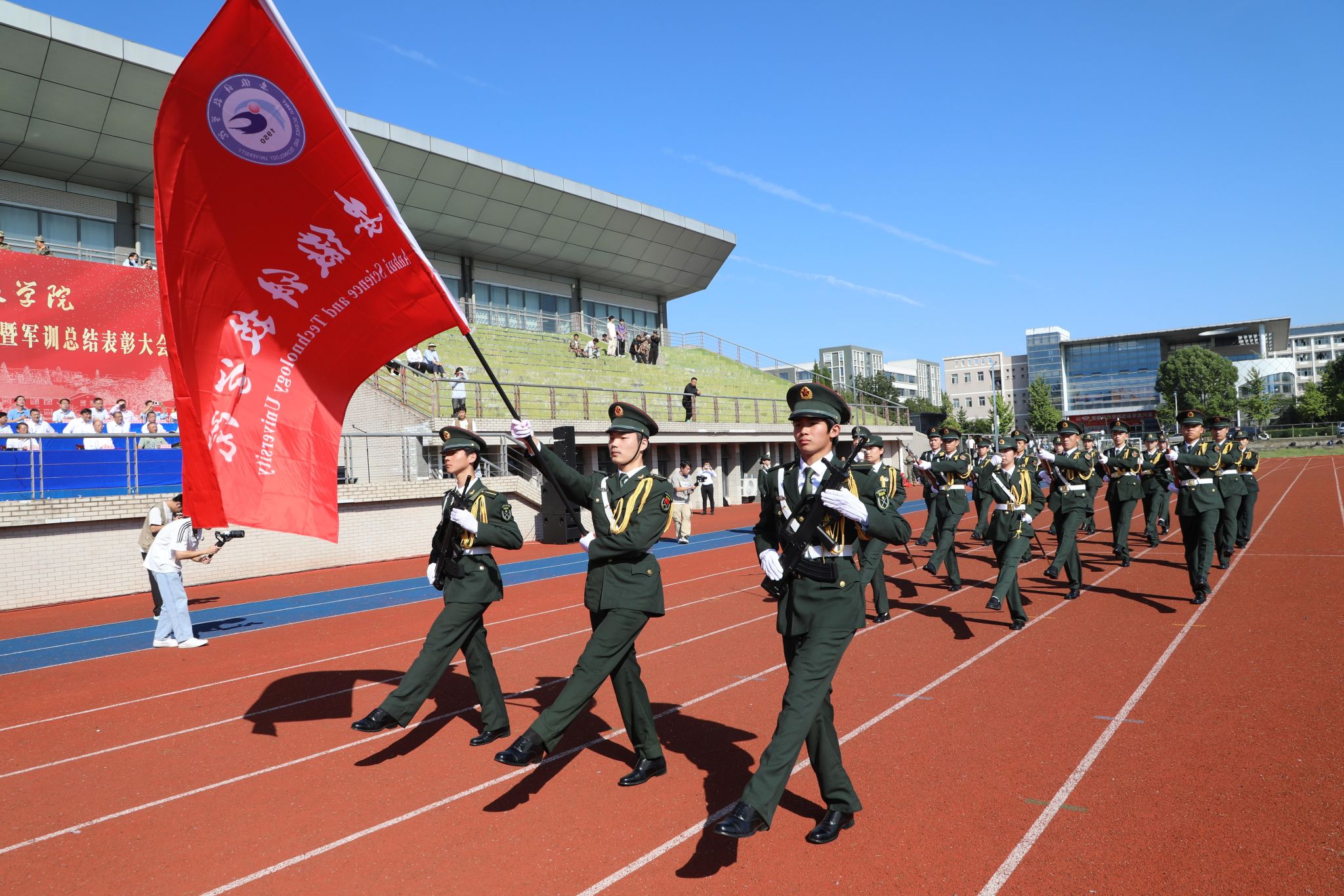 9月28日上午,我校凤阳校区2024级新生开学典礼暨军训总结表彰大会在西区田径运动场举行,校党委委员、副院长李升和,党委委员、副院长王孝义,党委委员、副院长赵伟峰,陆军装甲兵学院蚌埠校区中校、凤阳校区军训团团长范晓霄出席大会并在主席台就座。大会由赵伟峰主持。