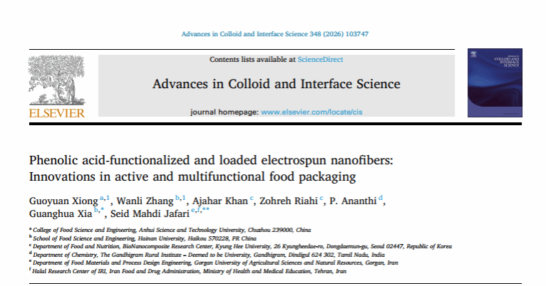 近日,我校食品科学与工程学院“特色食品绿色高效加工与创制”省级优秀科研创新团队带头人在Elsevier期刊《Advances in Colloid and Interface Science》(中国科学院一区TOP,IF 19.3)发表学术论文《Phenolic acid-functionalized and loaded electrospun nanofibers: Innovations in active and multifunctional food packaging》。我校熊国远教授和海南大学张万立副教授为文章共同第一作者,星空线上平台(集团)官方网站为第一署名单位。