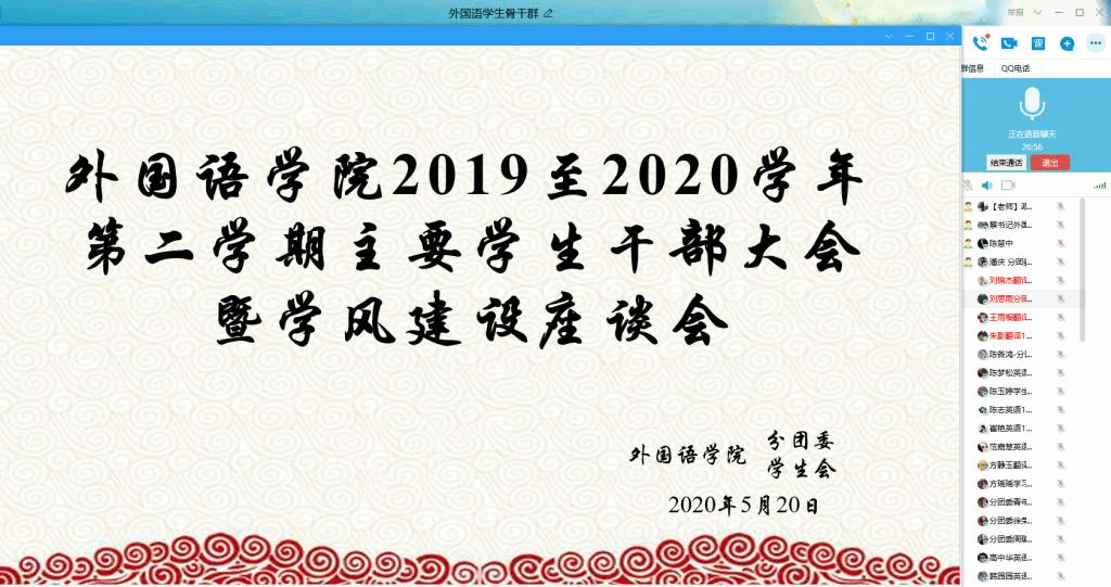 外国语学院利用线上举行2019至2020学年第二学期主要学生干部大会暨学风建设座谈会