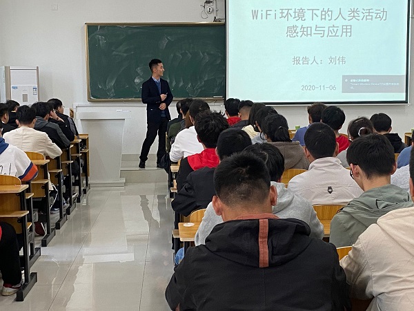 刘伟作了题为《WiFi环境下的人类活动感知与应用》的学术报告。报告会上,刘伟首先表达了自己对母校的感恩之情。并结合自己的研究实践,提出了一种能克服现有策略中侵入性强、环境依赖性强、易于隐私泄露、成本高等不足的新颖WiFi环境下的非接触式人类活动的检测策略。并就提出的基于敏感度的载波重构算法、基于背景模型的峰值检测算法、跨域特征联合下的动作分类策略等细节展开了详细论述。