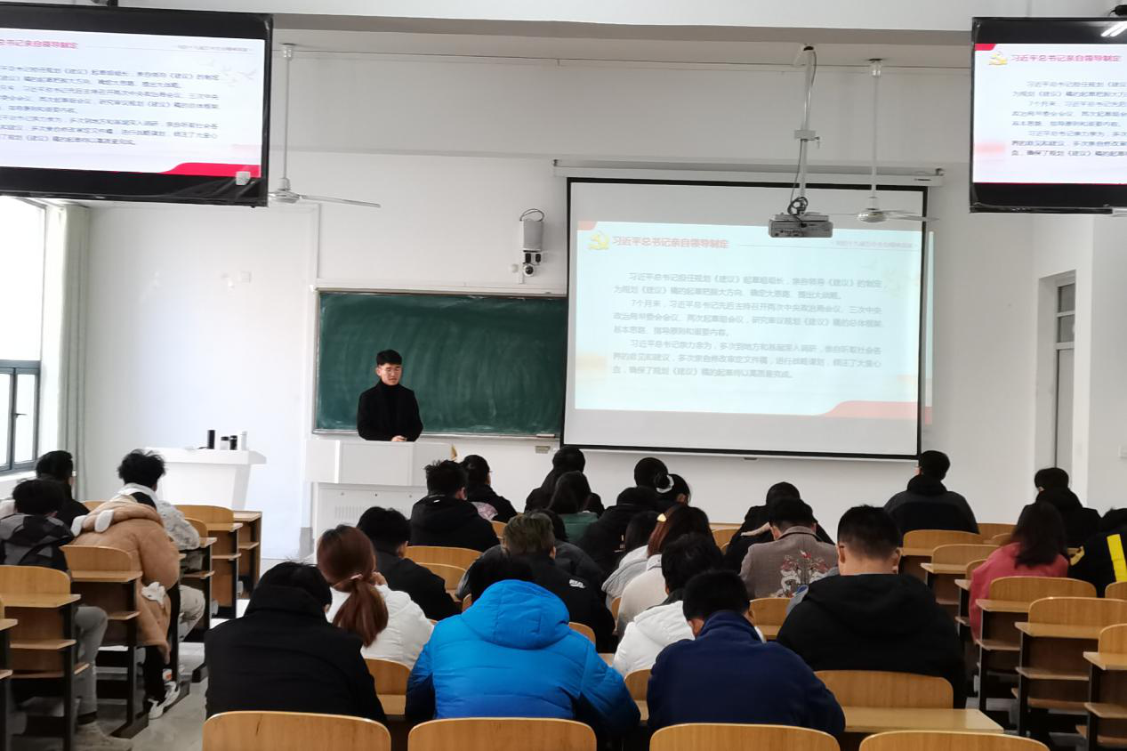 无机非金属材料工程专业学生党支部成立了党的十九届五中全会精神宣讲团,宣讲团统一制作了线上学习资料和宣讲PPT。在11月29日,党支部党员鲁玥、王号召和汪浩为2020级新生团支部讲了团课。宣讲团成员围绕《中共中央关于制定国民经济和社会发展第十四个五年规划和二〇三五年远景目标的建议》的起草过程、亮点内容、民生问题进行了详细解读,并介绍了双循环的新发展格局,对双循环的特点和意义进行了阐述,并对如何实现2035年远景目标进行了简要讲解。