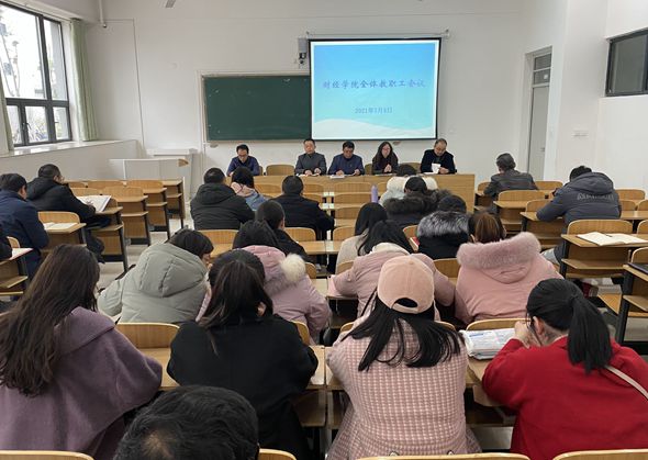 3月5日下午,财经学院在致知楼C103教室召开新学期全体教职工大会,部署新学期重点工作。学院党政班子及全体教职工参加会议,会议由院党委副书记、院长郝世绵主持。