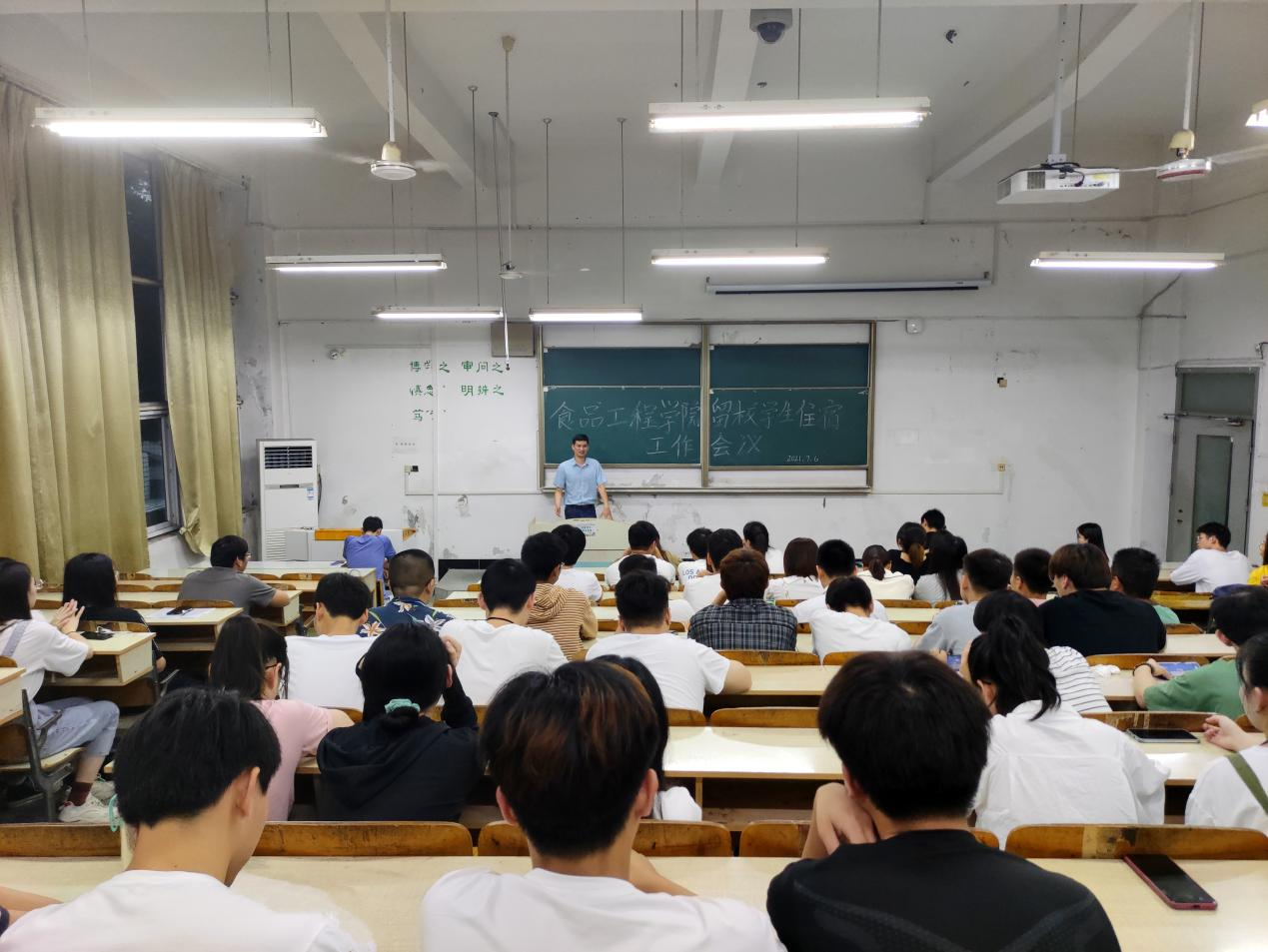 为确保暑假留校住宿学生安全,切实履行好学院安全管理责任,食品工程学院于7月6日上午在求知楼A座101教室召开2021年暑假留校住宿学生工作会议,院党委书记付光玺、副书记王广良和党政办主任赵传磊出席会议,食品工程学院100余名暑假留校住宿学生参加会议。会议由专职辅导员吴玘主持。