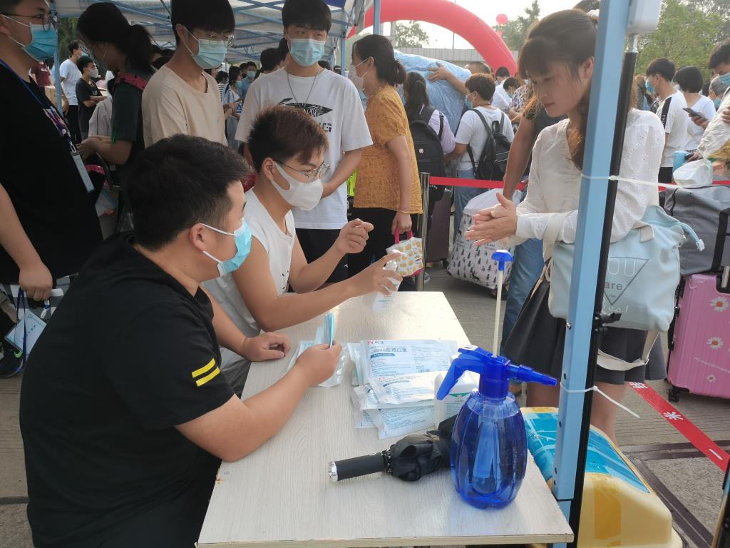 迎新现场工作人员有条不紊地展开迎新工作。辅导员与新生密切联系,不时通过QQ、电话等方式了解新生的行程和位置,确定报到时间并给予乘车指导。新生到校后,志愿者们热情上前接过家长手中的行李,引领新生消菌杀毒、更换口罩,出示核酸检测报告、行程码、返校通行证、通过面部识别再前往检录处进行检录,上交材料后领取宿舍钥匙和校园卡。最后由志愿者带着行李引导新生前往宿舍。