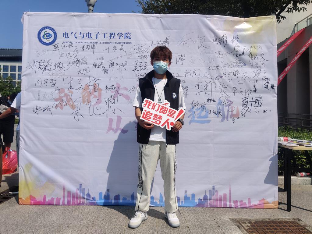 学院迎新处,王竑博一直忙碌着,给前来报到的同学喷消毒水、指引道路、搬运行李,他顾不上休息,一心只想服务同学。身着电气与电子工程学院志愿者服装的他,将自己身影留在了迎新点的各个角落。谈及如何想到去做一名新生志愿者时,“其实没有想太多,看着学长学姐为了帮助我们不辞辛劳,忙前忙后,我就想我也要做点什么。”王竑博如是说。抱着这样的想法,王竑博不顾十几个小时旅程的疲惫,按捺着初来大学校园时心里的兴奋,放下行李,他就投入到了志愿服务工作中,他用最朴实的行动,表达对学长学姐的诚挚谢意。