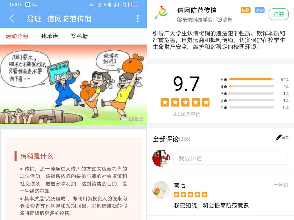 10月25-28日,学院在易班平台搭建了“信网防范传销倡议书”轻应用,充分利用知识学习模块将“金融传销”“网络传销”“旅游传销”“国家工程”传销、“假冒直销企业”传销、“假慈善”传销等多种传销骗局进行线上案例展示。学院全体学生主动学习各类防范传销知识并签署倡议书,在学习防范诈骗知识的过程中,有226名学生围绕着传销的种类、危害等方面参与讨论。