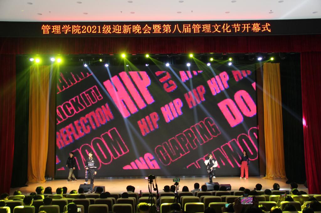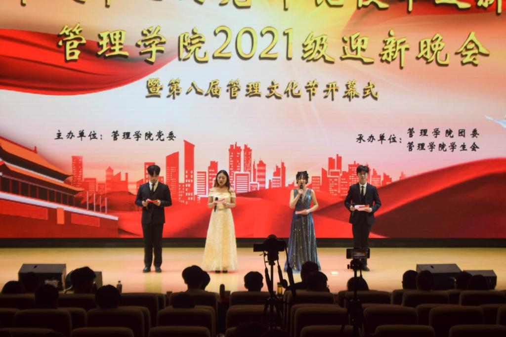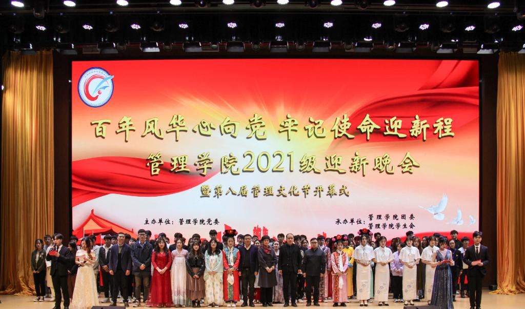11月20日晚,管理学院在龙湖校区东辅楼报告厅举行2021年“百年风华心向党,牢记使命迎新程”迎新晚会暨第八届管理文化节开幕式。党委书记丁景良,党委副书记、纪委书记陶漫,党政办公室主任李永鹏,团委副书记方辛、江旭聪,专职辅导员黄斐、姚姝媛,物流教研室教师武士文应邀出席晚会暨开幕式。龙湖校区各学院学生会及部分学生组织负责人、管理学院全体2021级新生也应邀观看晚会。