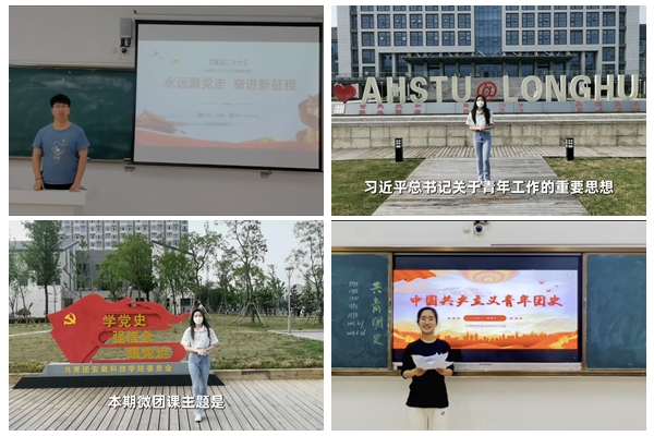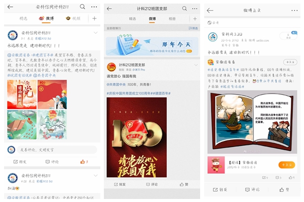 线上互动接力展示青春风采。各团支部在微博上积极参与安徽团省委微博推出的“青运史上的今天”“团务知识百问百答”“我与团旗合影”话题联动;通过拍摄微视频的形式踊跃参与团中央开设“永远跟党走 建功新时代"网络话题接力活动,展现奋进新征程、建功新时代的奋斗精神和青春风采。
