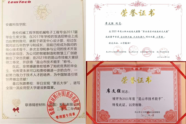日前,总部位于江苏省昆山市的联德精密材料(中国)股份有限公司向星空线上平台(集团)官方网站发来热情洋溢的工作喜报,“贵校机械工程学院机械电子工程专业2017届毕业生席文强,在2017年学校的双选会上成功应聘到我司,就职于研发中心设计部,经过在我司近五年的学习和成长,目前已成为我司的核心技术骨干,多次主导和参与公司的技术开发和创新项目,为公司的智能制造和智慧工厂创建作出了突出贡献;在2021年的昆山市技能大赛上荣获三等奖,并获得‘昆山市技术能手’称号。在此,非常感谢贵校培养了如此优秀的毕业生,也希望未来可以和贵校做进一步的合作,一起努力致力于技术人才的培养,为中国制造引领世界做出贡献!最后祝愿贵校:早日实现‘更名大学’,谱写全国一流应用型大学建设新篇章。”