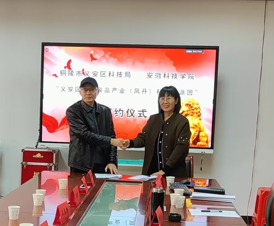 为进一步深化校企合作,提升产教融合,实现优势互补,结合省级科技特派团工作指导,11月25日,铜陵市科技局调研员张燕、义安区科技局副局长王立新、义安区科技局农村与社会发展科科长郑佳、铜陵亚通牡丹产业发展有限公司董事长孙后田一行赴我校食品工程学院进行交流指导,食品工程学院党委书记付光玺、副院长翟立公、副院长郑海波、研究生党支部书记桑宏庆、义安区健康食品产业(凤丹)科技特派团”团长杨剑婷及团员魏照辉、刘勇等相关老师热情接待并进行交流座谈,双方随后隆重举行义安区健康食品产业(凤丹)科技特派团签约及揭牌仪式。