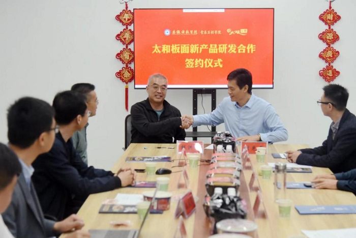 在安徽太板一号食品科技有限公司,付光玺一行与公司董事长胡洪彬、总经理魏继棠深入探讨合作机制。胡洪彬介绍了公司的发展历程、公司研发的太和板面系列产品,并就速食板面加工过程中遇到的技术难题与参会专家进行了深入的探讨。最后双方在太和板面功能性成分分析、板面调料包防腐保鲜、制定速食板面的行业标准等方面达成合作,现场签订了太和板面新产品研发合作协议,举行了星空线上平台(集团)官方网站食品工程学院大学生实习实训基地揭牌仪式。