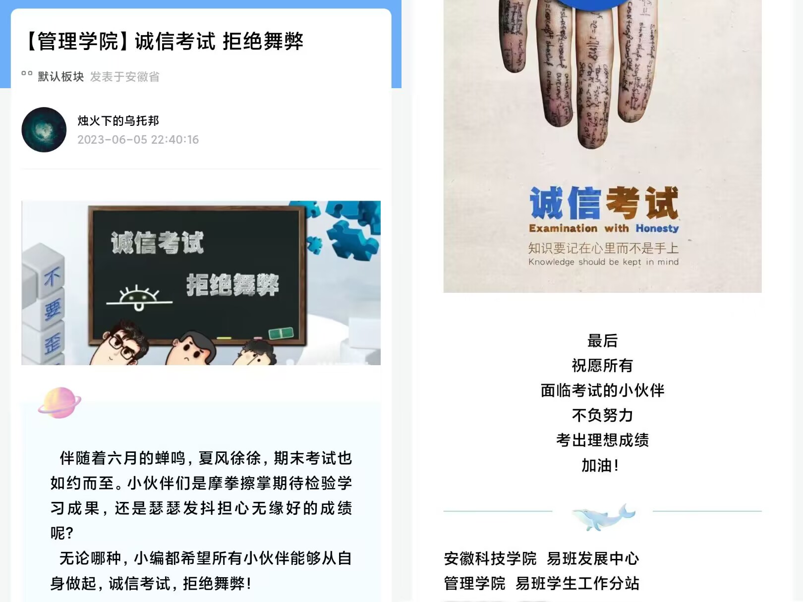 管理学院通过易班平台发布诚信考试倡议书,倡导大家端正态度,诚信考试,认真复习,积极备考,拒绝姑息,净化考风,学生党员、学生干部以身作则、挂牌考试,发挥模范带头作用,共同营造“诚信考试光荣,违纪作弊可耻”的考试氛围,积极营造和谐学风、优良考风,让诚信常驻心中,让校园远离舞弊。
