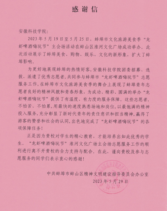 感谢信提到,星空线上平台(集团)官方网站团委招募、选拔、派遣了优秀志愿者,共同参与蚌埠市“龙虾啤酒嗨玩节”志愿服务工作,在蚌埠市文化旅游美食季的舞合上展现了蚌埠青年志愿者良好的精神风貌和青春形象,为成功、精彩、圆满的举办“龙虾啤酒嗨玩节”提供了有温度、有力度的服务保障。志愿者们不怕苦、不怕累,用最快的速度熟悉场地和岗位,以最饱满的精神投入服务,充分彰显了新时代青年的责任意识和担当精神,赢得了游客的赞誉和社会的认同,出色地完成了“龙虾啤酒嗨玩节”的各项保障任务!正是因为贵校对学生的精心教育,才能培养出如此优秀的学生。“龙虾啤酒嗨玩节”淮河文化广场主会场志愿服务工作的顺利进行离不开贵校的全力支持与配合。在此,谨向贵校及参与志愿服务的同学们表示衷心的感谢。