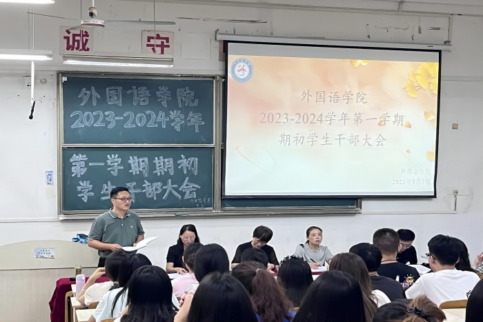 9月3日下午,外国语学院在求知楼A105教室召开2023年秋季学期期初全体学生干部大会。学院全体党政领导、辅导员出席会议,学院团委、学生会、艺体中心、易班工作站负责人以及各班级主要学生干部参加会议,会议由学院党委副书记张海亮主持。