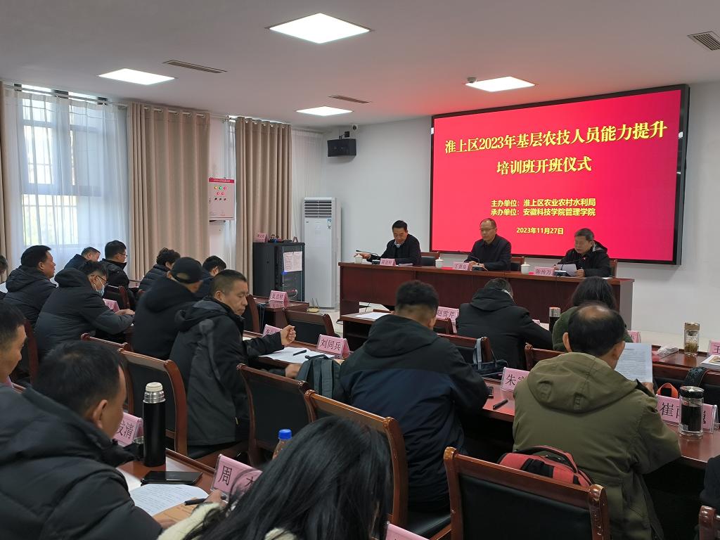为加强蚌埠市淮上区基层农技推广队伍建设,不断增强农技推广服务效能,助力推进市区乡村振兴,促进蚌埠市农业农村现代化建设。11月27日上午,由蚌埠市淮上区农业农村水利局主办、星空线上平台(集团)官方网站管理学院承办的“淮上区2023年基层农技人员能力提升培训班”在安徽小岗干部学院举行。蚌埠市淮上区农业综合服务站站长吴言柱、管理学院党委书记丁景良、管理学院院长陈传万出席开班仪式,开班仪式由丁景良主持。