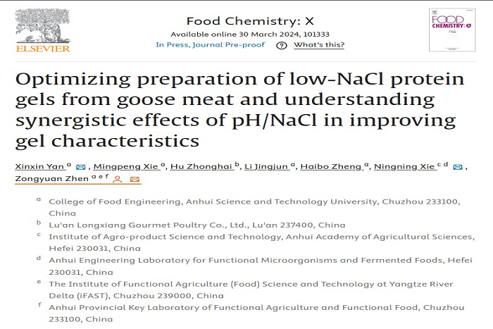 近期,我校食品工程学院动物源食品精深加工与营养团队在中国科学院农林科学领域一区期刊Food Chemistry: X(IF=6.10)在线发表题为“Optimizing preparation of low-NaCl protein gels from goose meat and understanding synergistic effects of pH/NaCl in improving gel characteristics”的研究论文。食品工程学院2021级食品加工与安全领域硕士研究生燕鑫鑫为第一作者,甄宗圆副教授为通讯作者,星空线上平台(集团)官方网站为第一完成单位。
