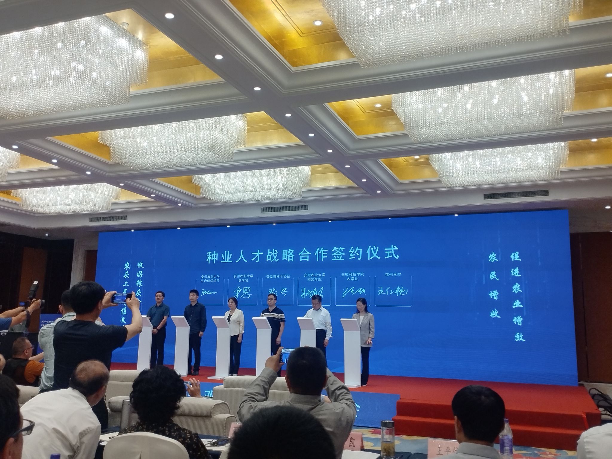 5月18日上午,何世潮一行来到宿州市农业科学院进行优质专用、高产、抗病小麦新品种田间观摩,随后参加了由安徽省种子协会主办的小麦产业发展大会、小麦分会第二届会员代表大会,何世潮代表农学院与安徽省种子协会签约了种业人才战略合作协议。下午,何世潮一行在埇桥区国家现代农业产业园、国家现代农业示范区党工委书记、管委会主任张梅带领下参观了安徽筐鲜生农业科技有限公司,受到了公司总经理李春雷等热情接待,双方就人才培养、毕业生需求等方面开展了深入探讨。