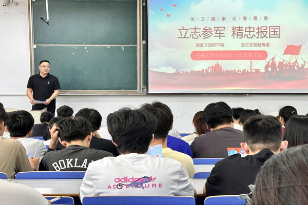充分发挥应征入伍退役大学生的示范引领作用,组织退役大学生在两校区开展宣讲服务活动,邀请他们讲述自己的军旅故事及成长历程,分享他们对于国防和军队现代化建设成就的深刻感悟,号召同学们在军营中放飞青春梦想,厚植家国情怀,引发青年学子保家卫国的共鸣。
